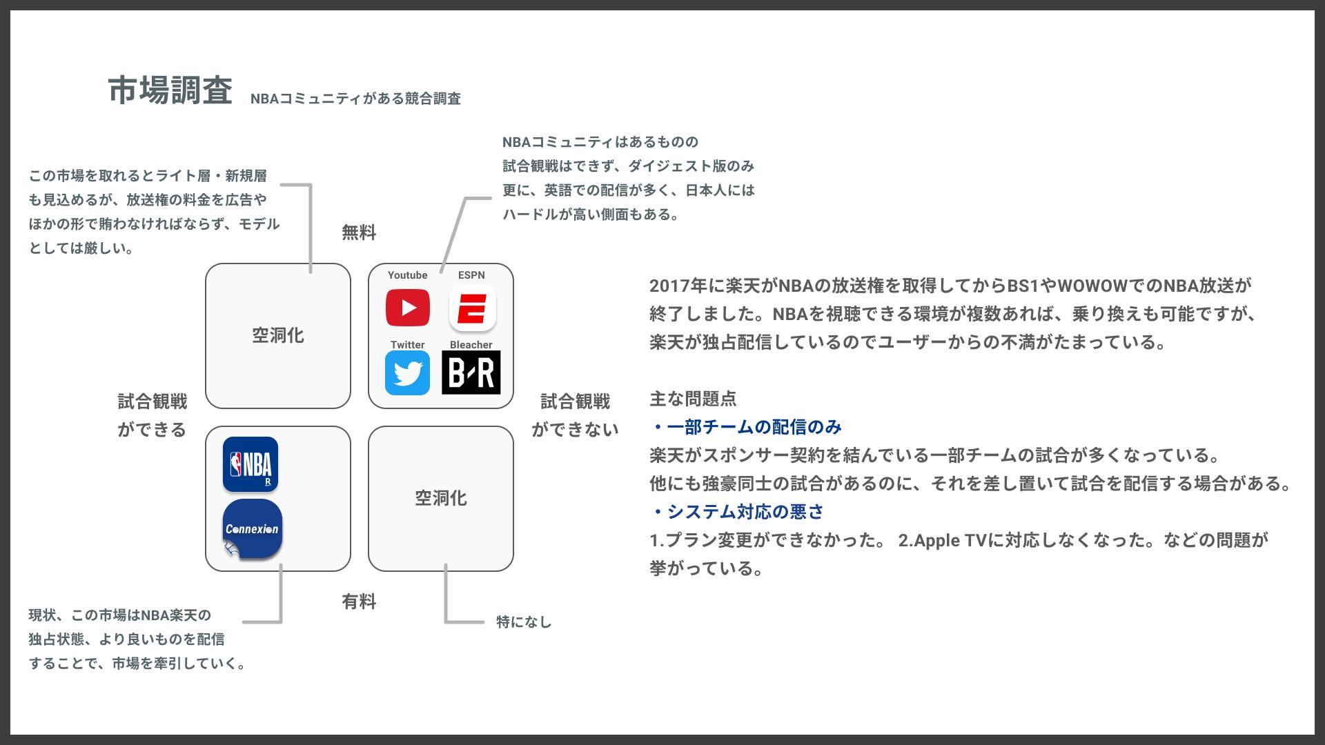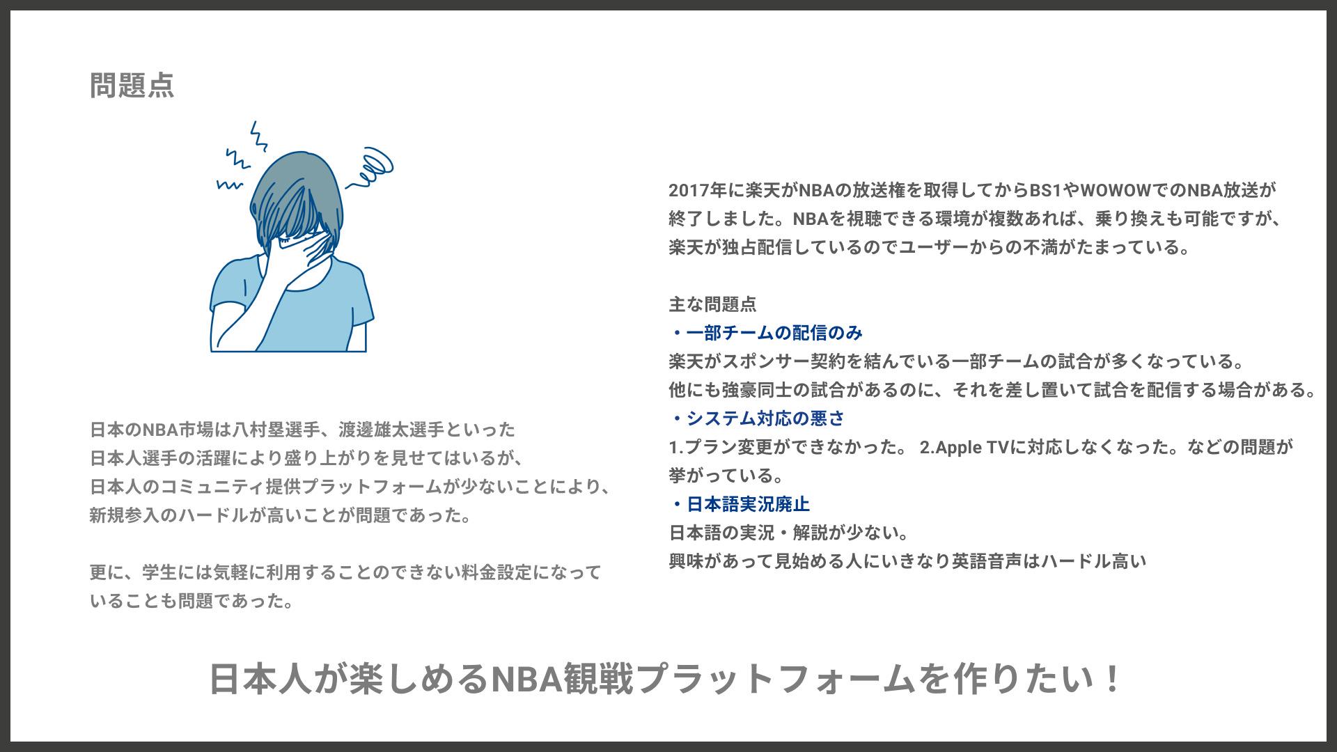 日本のNBA市場は八村塁選手、渡邊雄太選手といった日本人選手の活躍により盛り上がりを見せてはいるが、日本人のコミュニティ提供プラットフォームが少ないことにより、新規参入のハードルが高いことが問題であった。