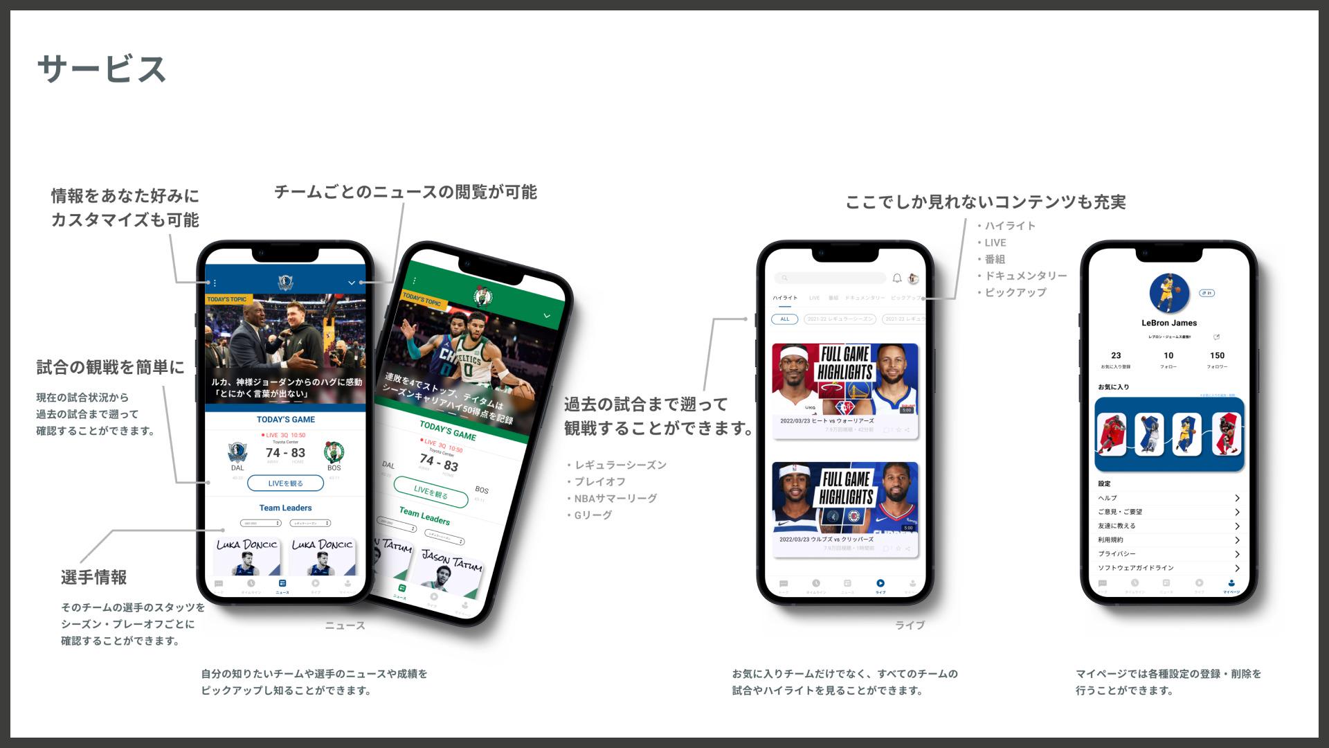 日本人でも気軽にNBA観戦が楽しめるプラットフォームアプリのUIUXデザインです。