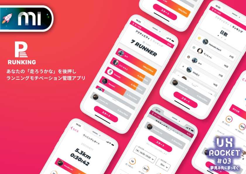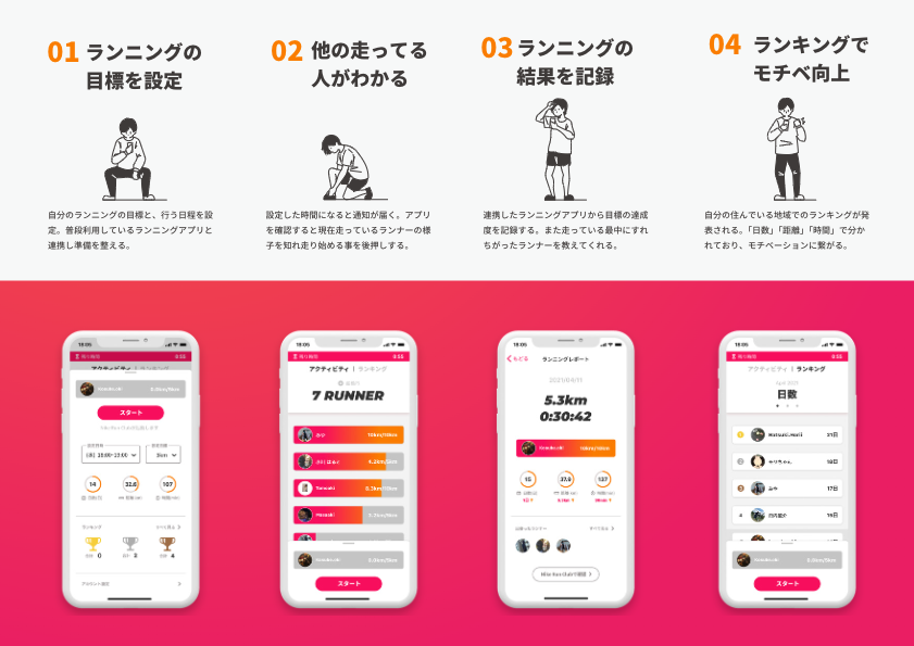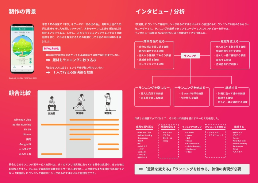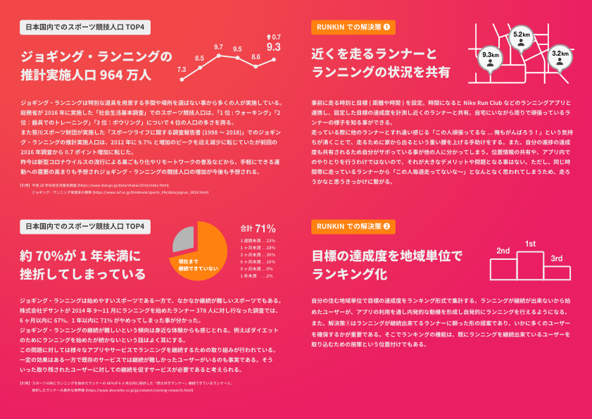 ランニングがなかなか長続きしない...といった人に向けた、ランニングのモチベーションを維持するためのアプリ提案です。 ランニングの特徴に着目しアイデアを検討しました。