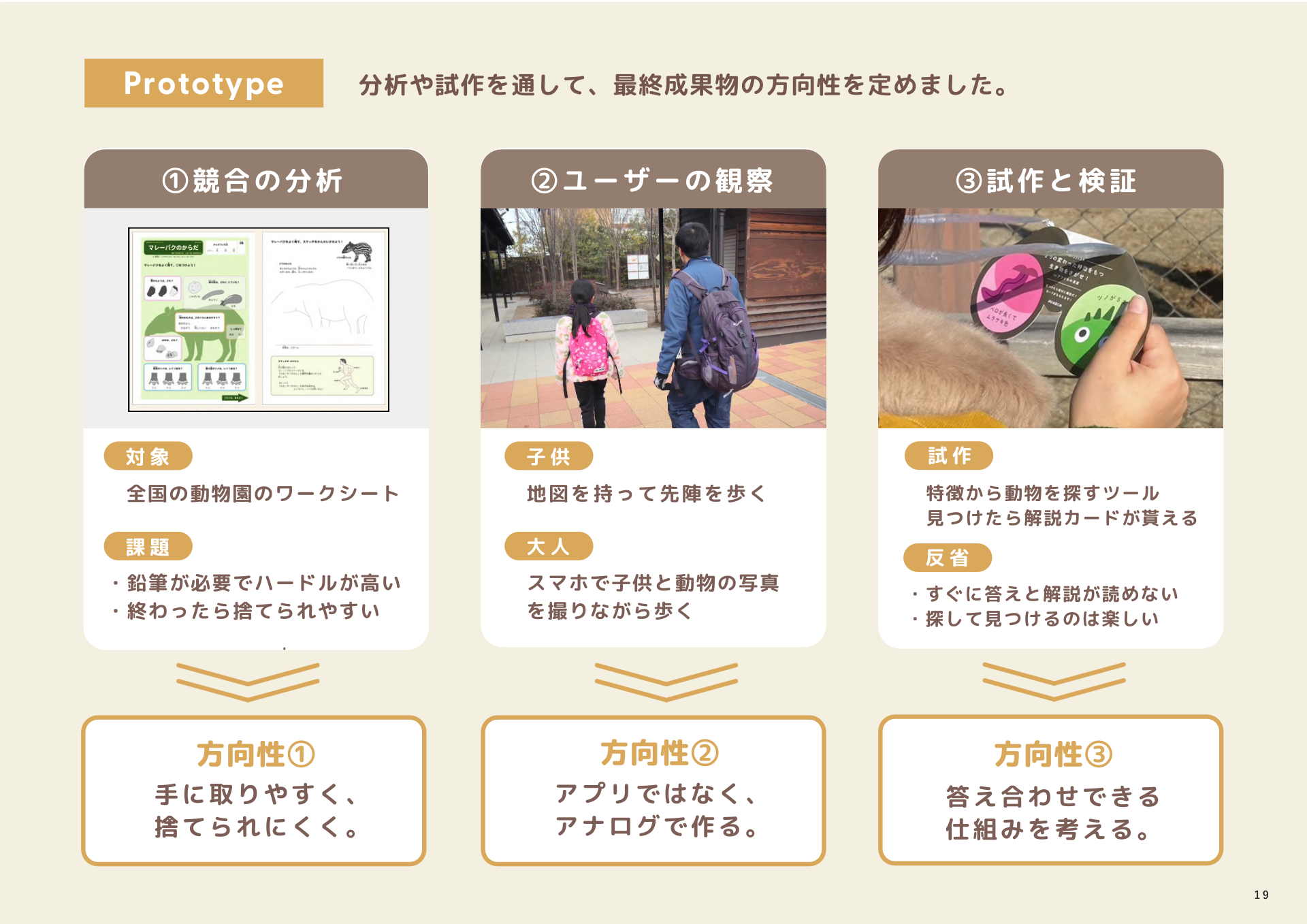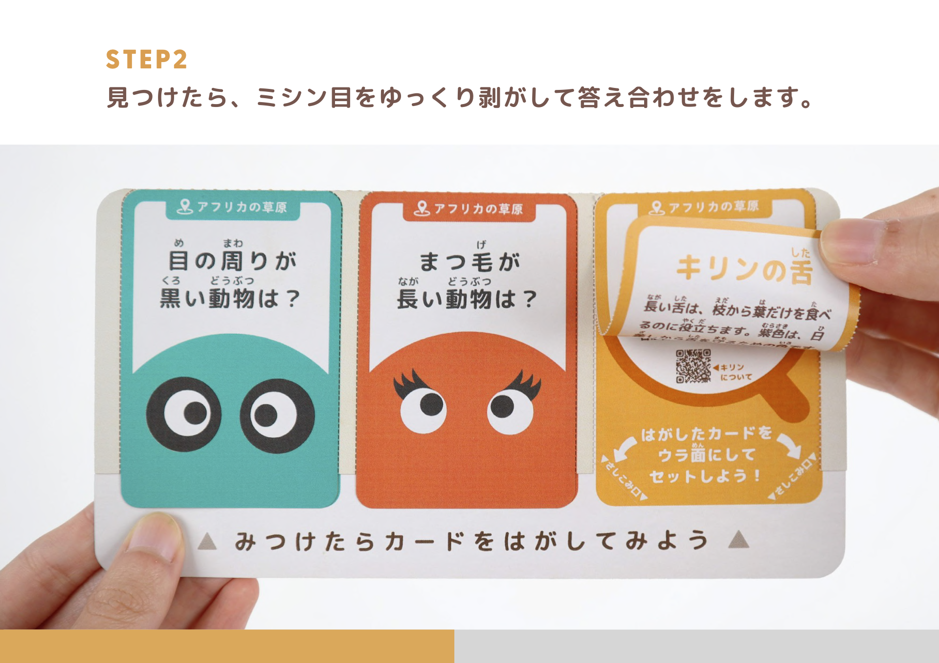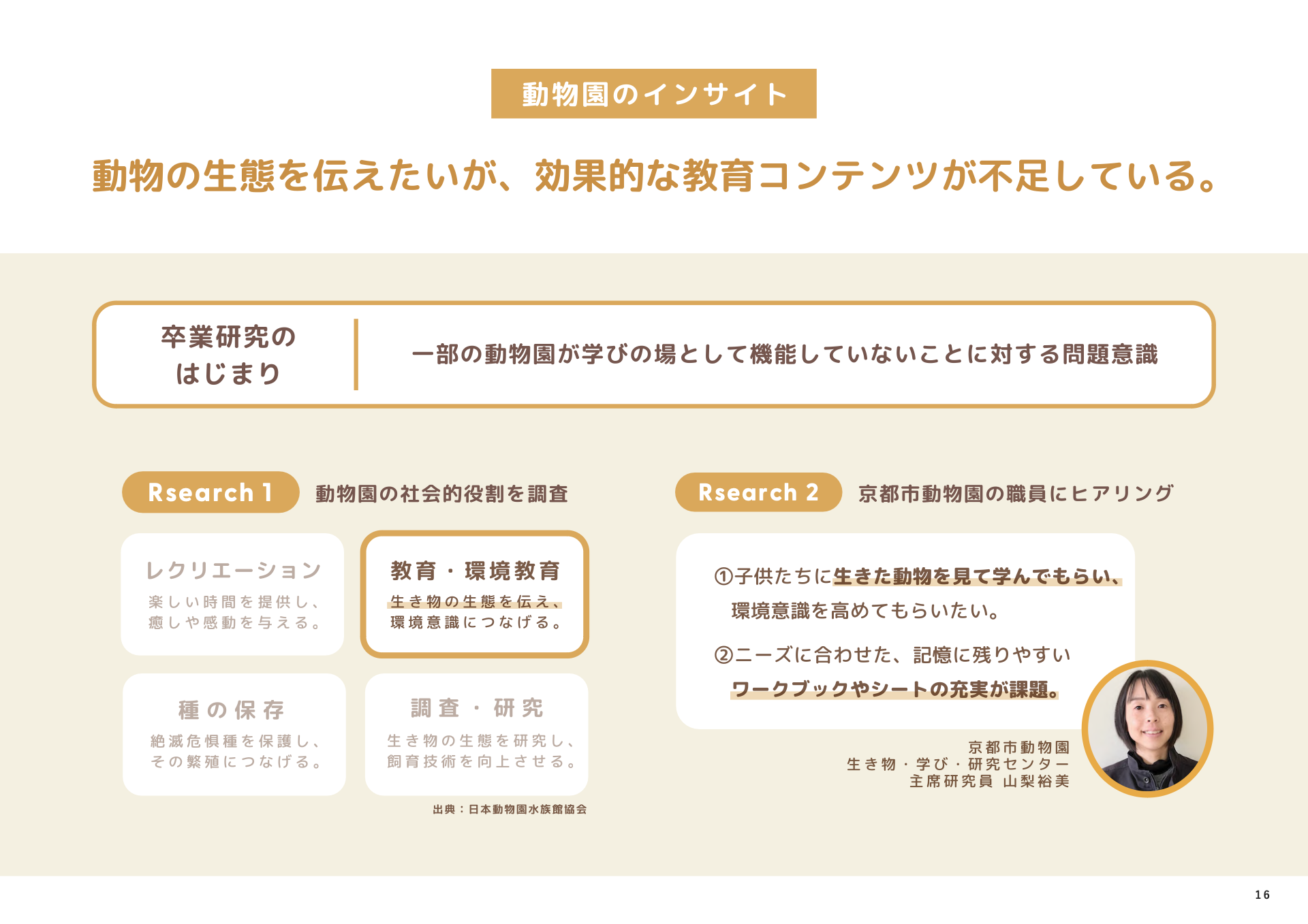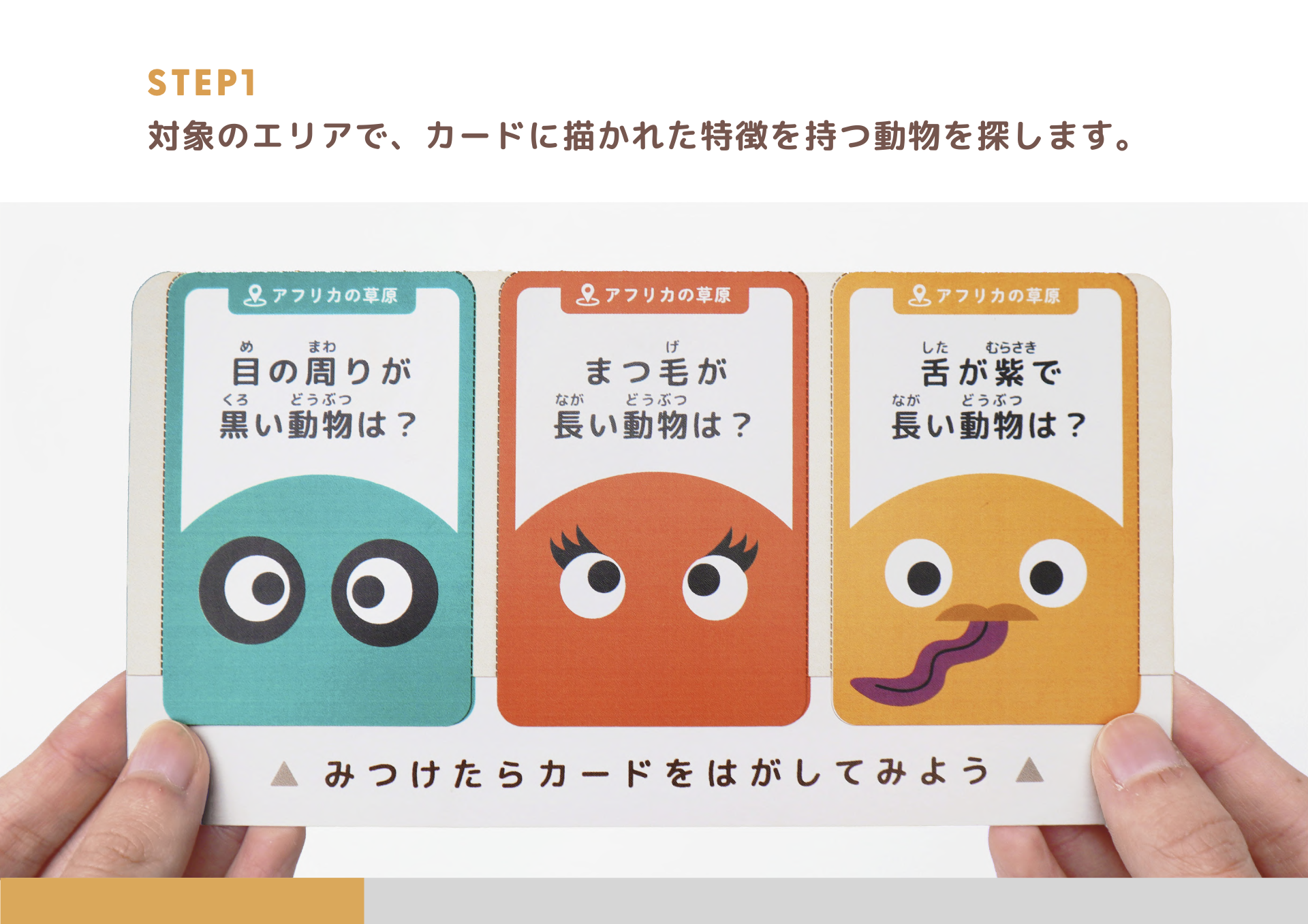 動物園は教育を通じて、子どもの環境意識向上を目指しているが、学ぶ意欲のある来園者は少ない。そこで、親子が楽しみながら生態を学べるツールを制作した。